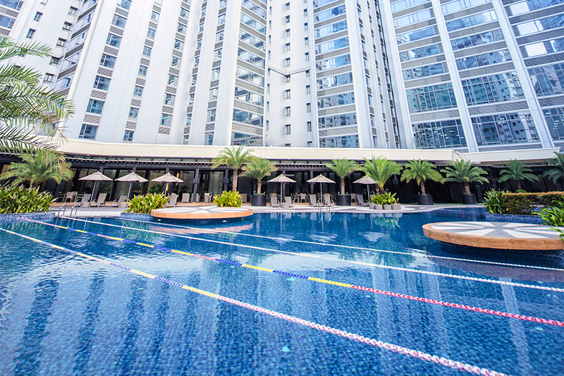 Our expansive, lagoon-style swimming pool features a children’s pool, a lap pool for fitness enthusiasts, and a recreational pool for leisurely swims. The veranda provides a comfortable spot for lounging, while sunbathing decks offer the perfect place to relax and soak up the sun. Guests can also enjoy refreshing drinks and light bites by the pool, making it an ideal spot to unwind throughout the day.